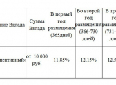 - в течении третьего года размещения - за первый год действия вклада по ставке 11.85% годовых, за второй год действия вклада по ставке 12.15%, свыше второго года до даты расторжения договора по ставке 3 % годовых.