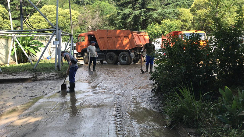 Кроме того, казаки очищают территорию детского сада №83 в Хосте после потопа.