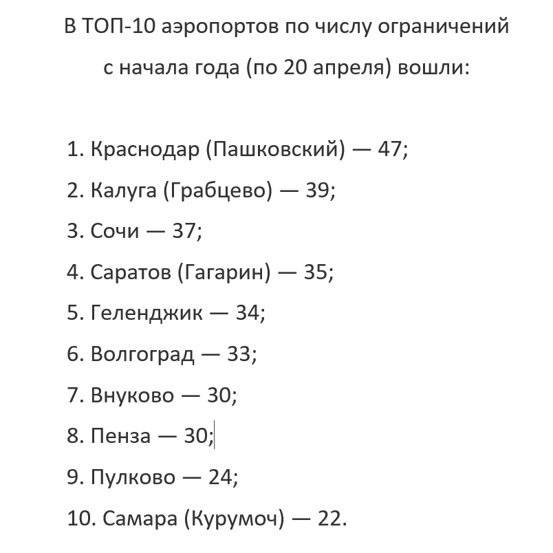 В АТОР также составили топ-10 аэропортов по числу ограничений с начала 2026 года по 20 апреля. В первую тройку вошли две воздушные гавани Краснодарского края.