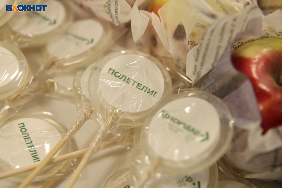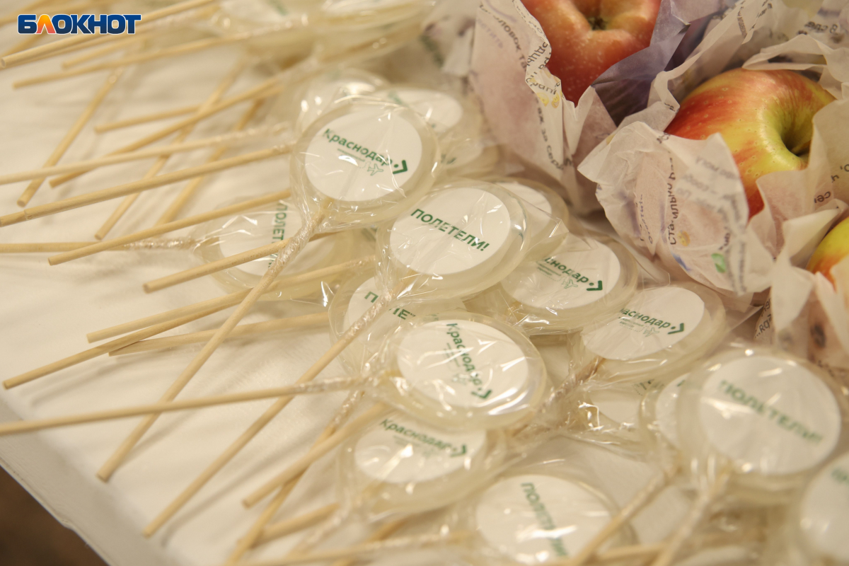 У стоек регистрации царила атмосфера праздника. Совсем рядом организовали стол с памятными, а главное - вкусными подарками, которые мог взять любой. Кубанские яблоки в обертках с новостями об открытии аэропорта, а также сатирическими комментариями самих краснодарцев.