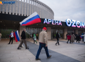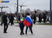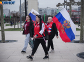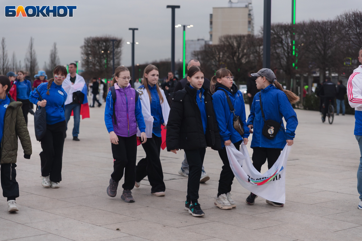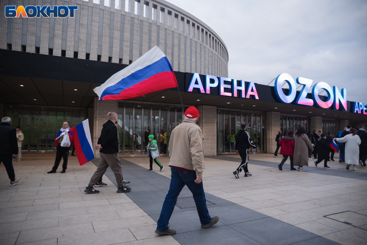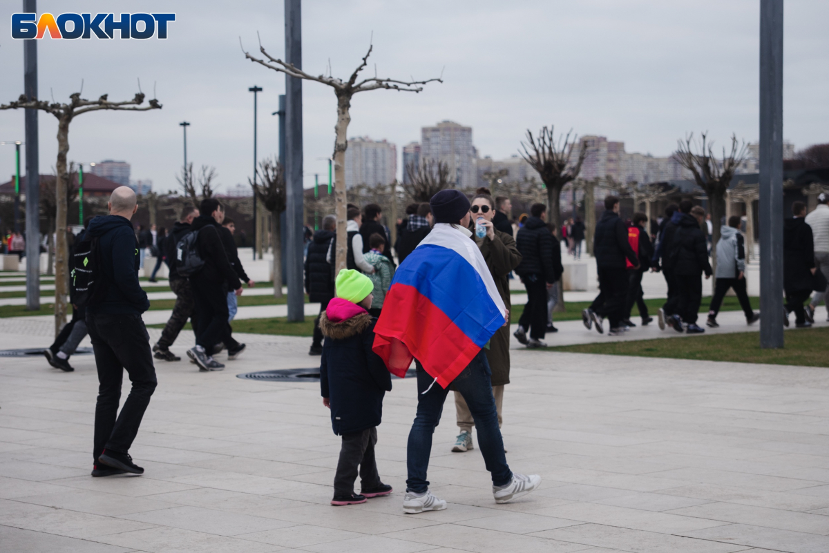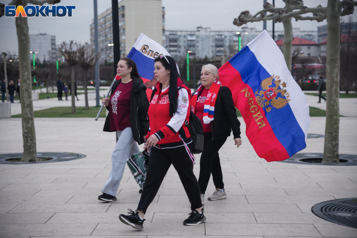 Множество жителей Краснодара и приезжих из других городов пришли с флагами, шарфами и дружно скандировали “Россия”.