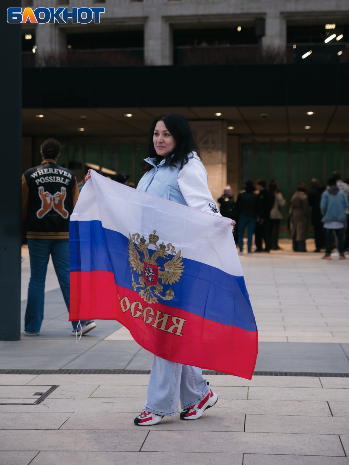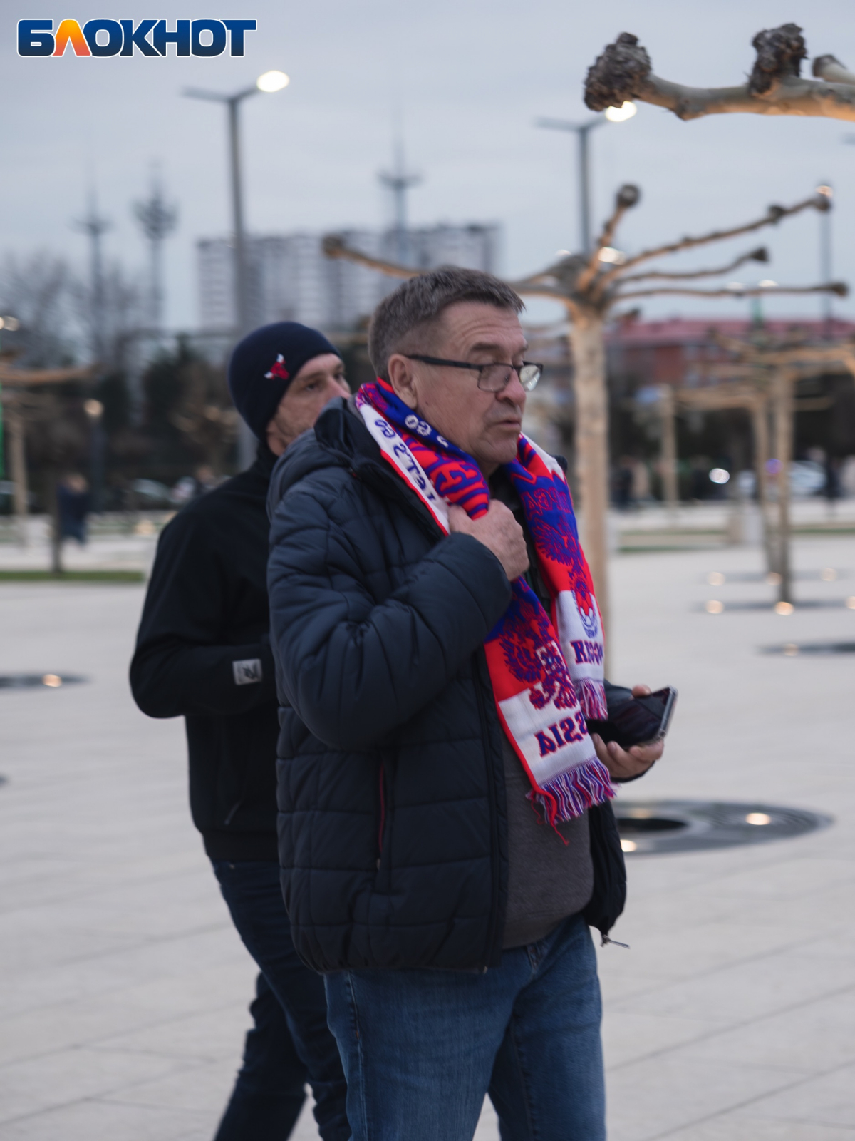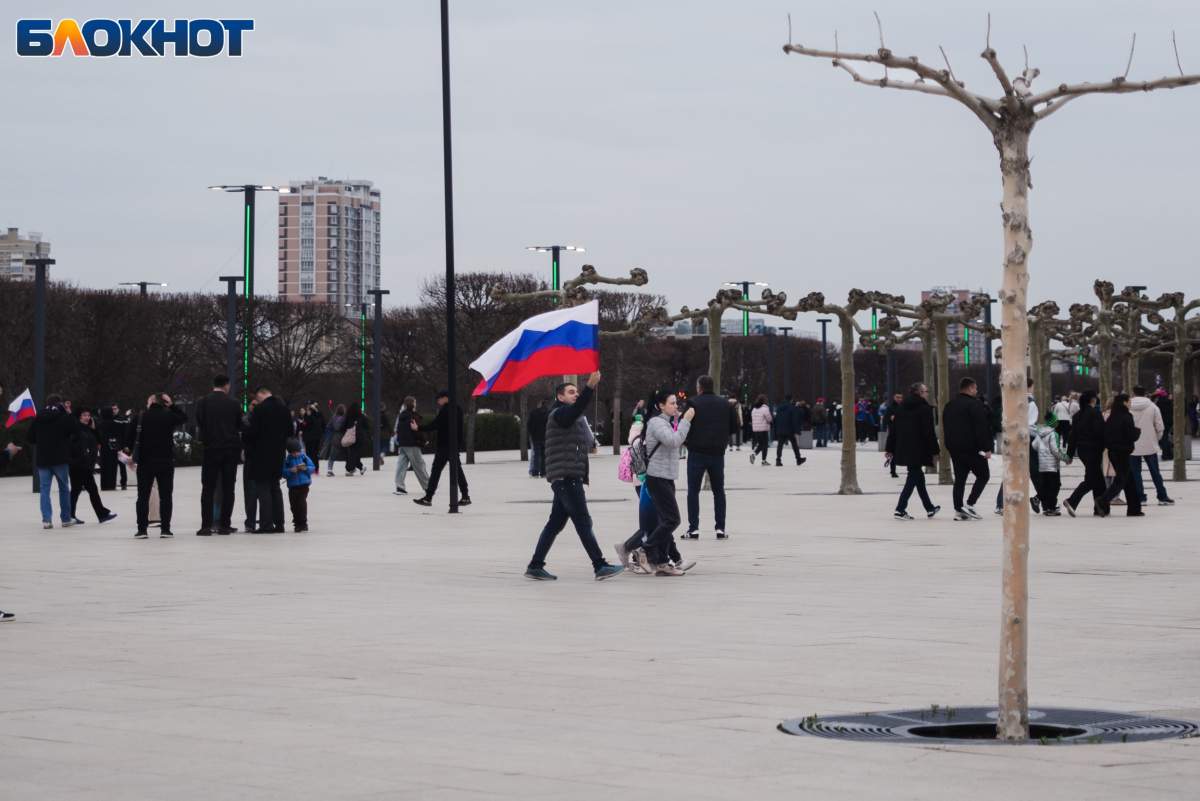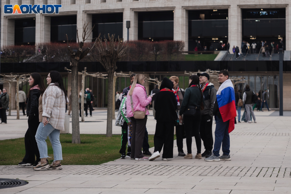 Множество жителей Краснодара и приезжих из других городов пришли с флагами, шарфами и дружно скандировали “Россия”.