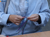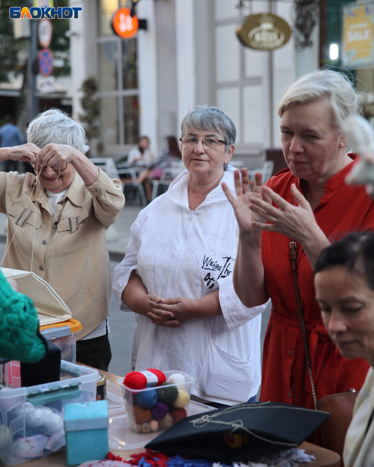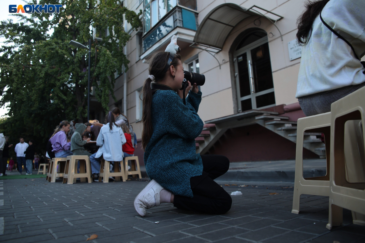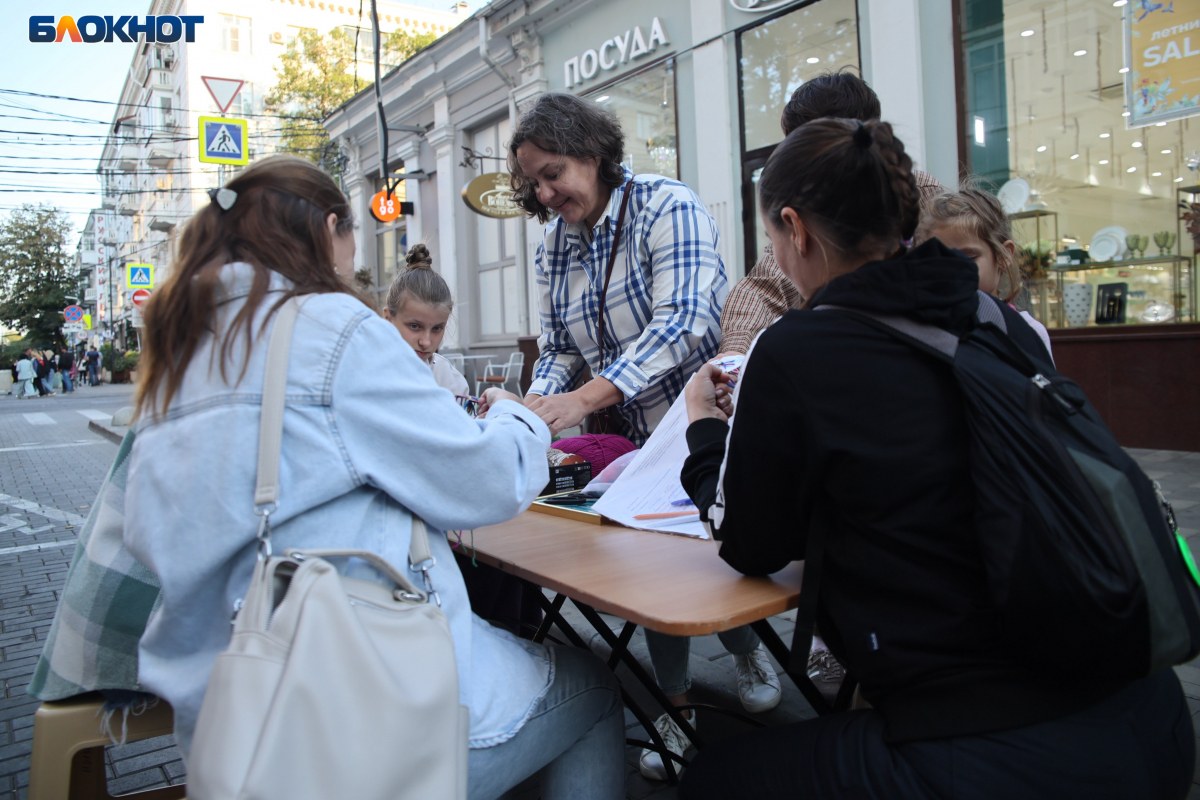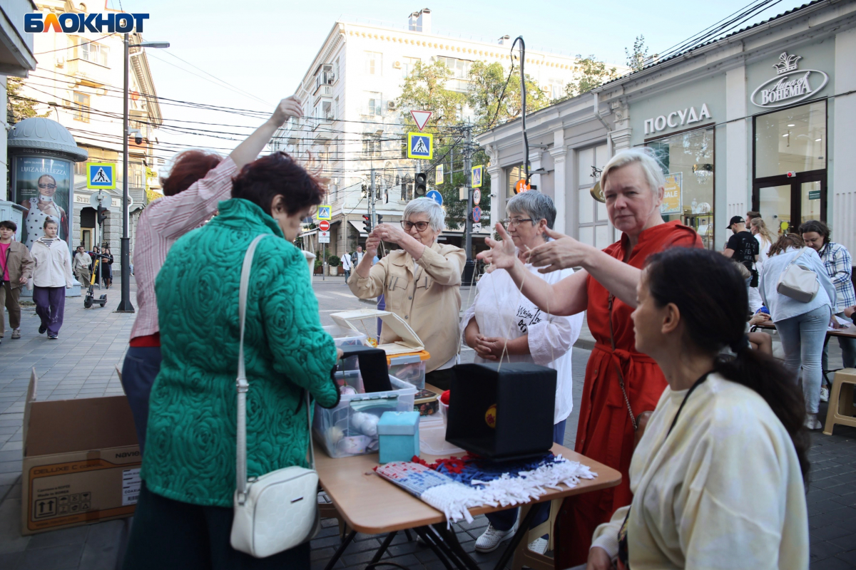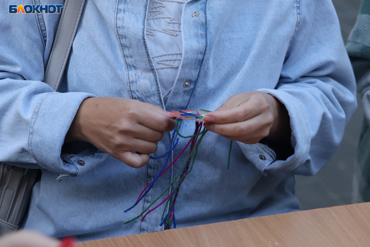 Перекрытый на выходные участок улицы поделили на зоны с активностями. В одной жителей учили плести браслеты-фенечки в цветах кубанского флага: синего, малинового и зелёного. Их забирали себе на память.