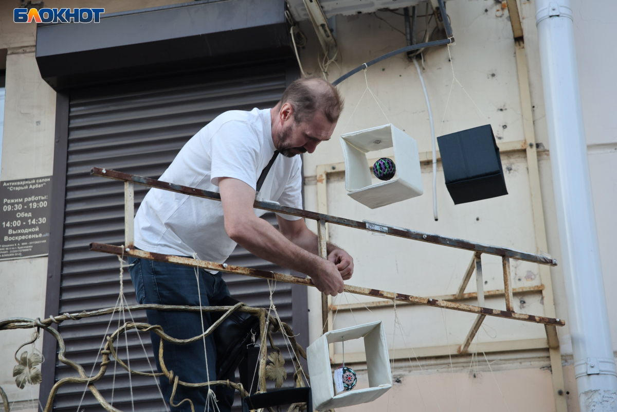 Также на краснодарском Арбате провели мастер-класс по изготовлению необычных сувениров: кубов, внутрь которых вешали сплетённый из нитей шар. Кроме того, жителей ознакомили с основами чеканки.