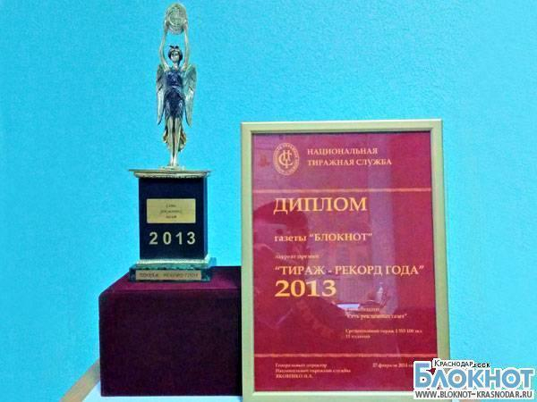 В Москве состоялось вручение ежегодной национальной премии «Тираж - рекорд года», где пятый год подряд ее лауреатом стала самая массовая газета Краснодарского края «Блокнот». Премию вручаила Национальная тиражная служба – единственная организация в России, имеющая международный сертификат на экспертизу тиражей печатных СМИ.