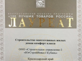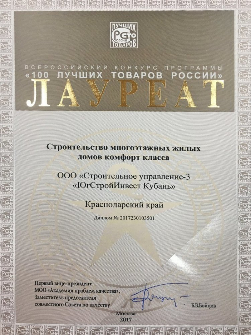 ГК «ЮгСтройИнвест» стала победителем регионального этапа всероссийского конкурса «100 лучших товаров России»