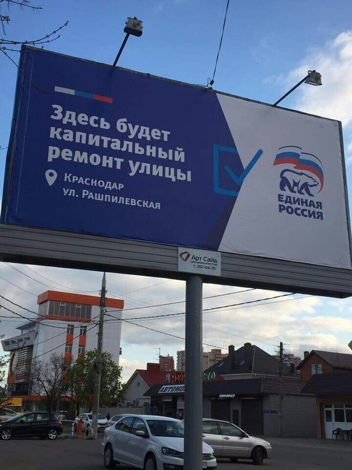 Активная предвыборная кампания партии «Единая Россия» только началась, но уже подверглась нападкам со стороны интернет-пользователей из Краснодара. Ранее в сети появилась фотография баннера, гласящего, что на улице Рашпилевской будет капитальный ремонт улицы, с намеком на то, что к этому причастна партия.