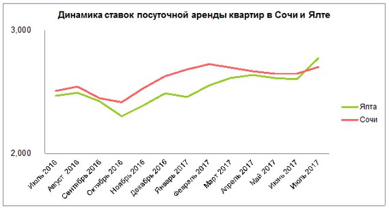 По данным экспертов, в июле 2017 года средняя стоимость посуточной аренды квартир зафиксирована в Ялте - 2,8 тыс. рублей. Портал отмечает, что в прошлом году самым дорогим городом для отдыха был Сочи. На за прошедший год стоимость аренды здесь повысилась только на 7,7 процентов, а вот в Ялте на 12,3 процента. При этом Сочи сохраняет статус всесезонного курорта, где, по данным экспертов, осенью и зимой ставки посуточной аренды в городе выше, чем на южном берегу Крыма.