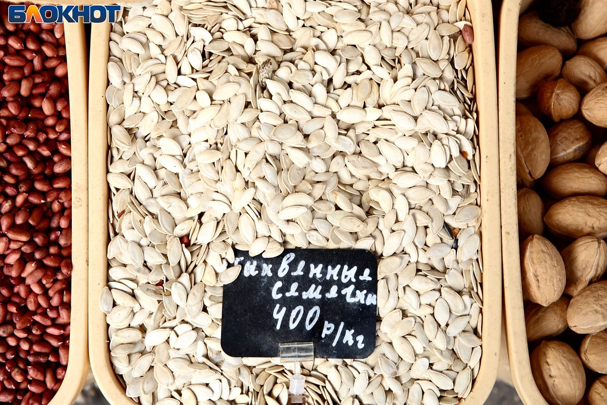 В крытой части рынка есть урбеч в небольших красивых баночках. Наполнение разное: из миндаля, абрикосовых косточек, кунжута, льна. Стоимость – от 200 до 600 рублей. А если захотелось полакомиться семечками, можно купить подсолнечные или тыквенные, которые обойдутся в 250-400 рублей за килограмм.