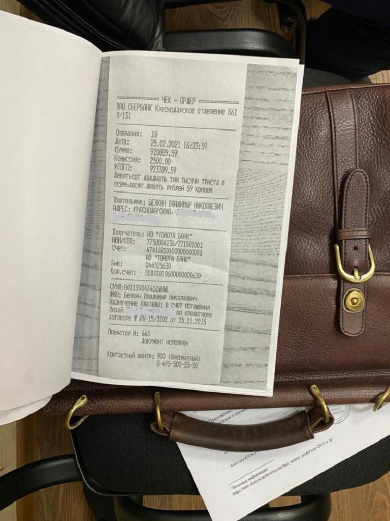 Супруги Рыловы предложили Белкину упростить всю процедуру и сразу поставить на учет в ГАИ «лендкрузер» на них, а деньги перевести после оформления на счет в Сбербанке. Покупатели проверили транспортное средство в соответствующих базах, при проведении сделки в Краснодаре никаких проблем и не возникало. Авто в ГАИ зарегистрировали, деньги на счет зачислили (в распоряжении редакции есть документы о зачислении суммы).