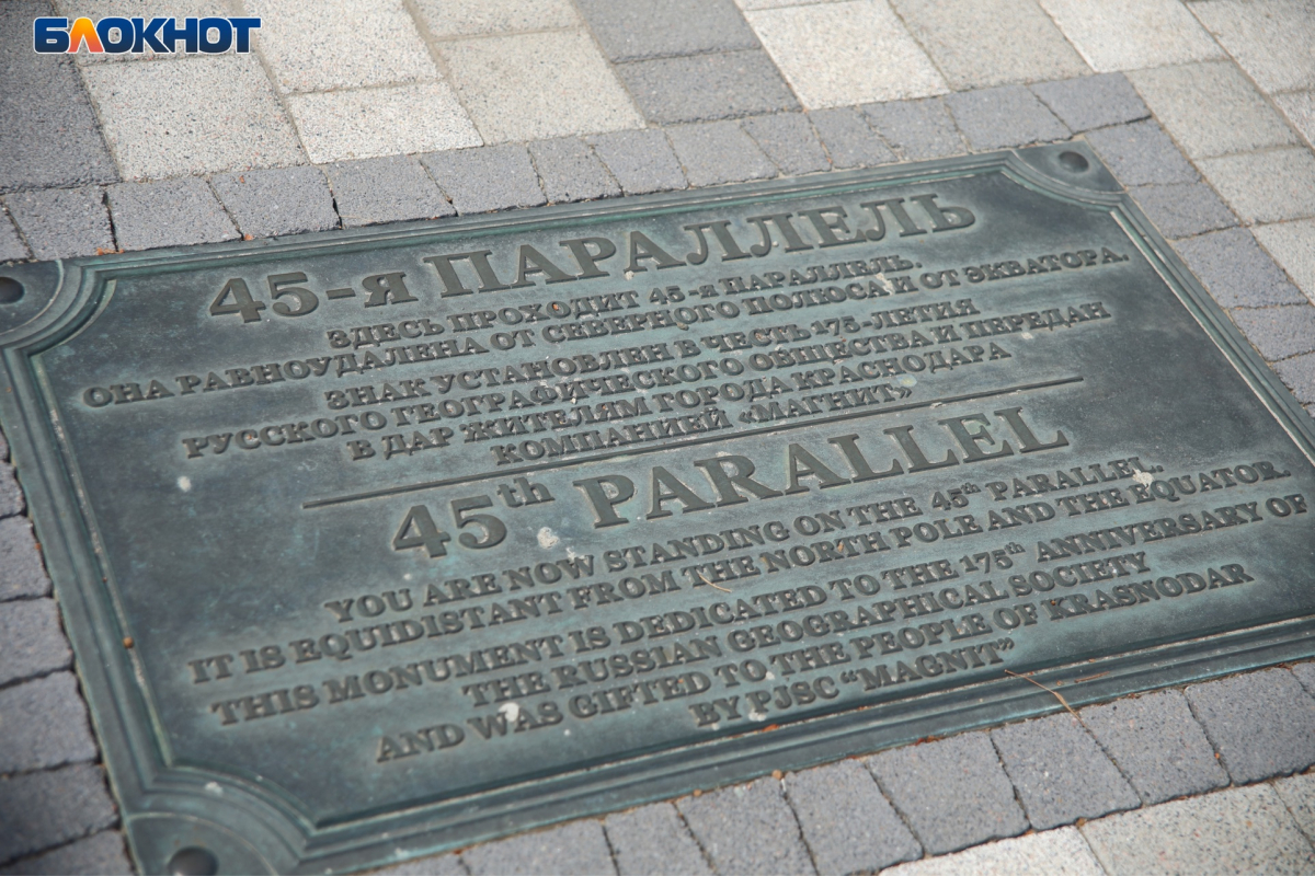 В этом районе установлена скульптура «45-я параллель», ведь именно она проходит через наш город. Это означает, что Краснодар равноудален от Северного полюса и экватора Земли.