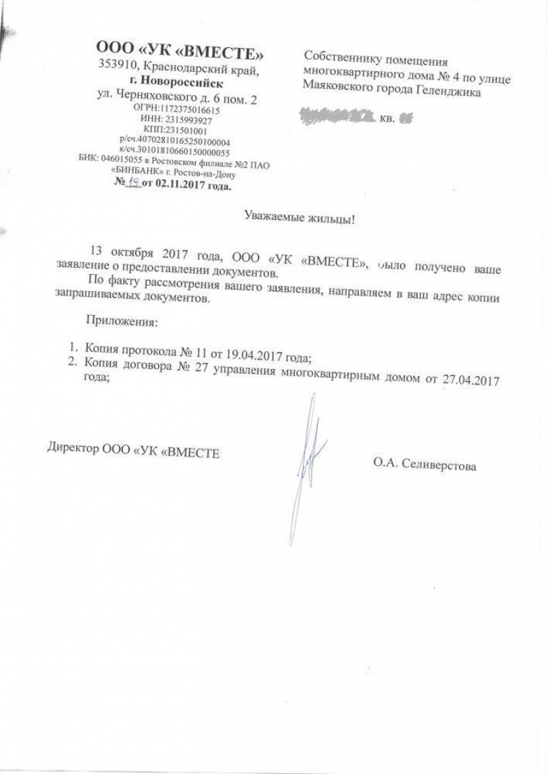 - Вот так «добросовестно» работает замечательная «УК Вместе». Гораздо интереснее, почему правоохранительные органы, в том числе прокуратура города Геленджика не обращает внимания на методы работы «УК Вместе», ведь жильцы дома № 4 по улице Маяковского направляли заявление в прокуратуру с требованием проверить законность перехода дома в управление «УК Вместе», - рассказали жители дома «Блокноту Краснодара».