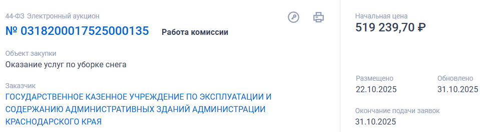 На сайте госзакупок проводится электронный аукцион на оказание услуг по уборке снега. Заказчиком выступает ГКУ по эксплуатации и содержанию зданий администрации Краснодарского края.