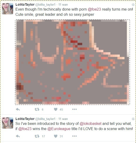 Порнозвезда Лолита Тейлор изъявила желание сняться в одной сцене с баскетболистом «Локомотив Кубань». Об этом актриса написала в своем твиттере. «Что ж, я посмотрела историю «Локомотив Кубань» и скажу вам, что, если Дилэйни возьмет титул Евролиги, я хотел бы снять сцену с ним!», - написала она.