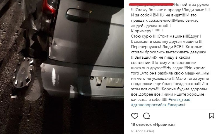 - Не пейте за рулем! Скажу больше и правду! Люди злые! И за собой ВИНЫ не видят! И это правда, к сожалению!Мало сейчас людей адекватных! К примеру! Стоит машина! Вдруг! Въезжает в машину другая машина!Перевернулась! Люди ВСЕ! Которые стояли бросились вытаскивать девушку. Вытащили! Я не пишу в каком состоянии! Потому что состояние шока, оно другое! Ну ладно! Но кроме того, что она разбила свою машину, мы ничего не услышали! Мало того, группа поддержки еще более неадекватна! И в этом вся суть!