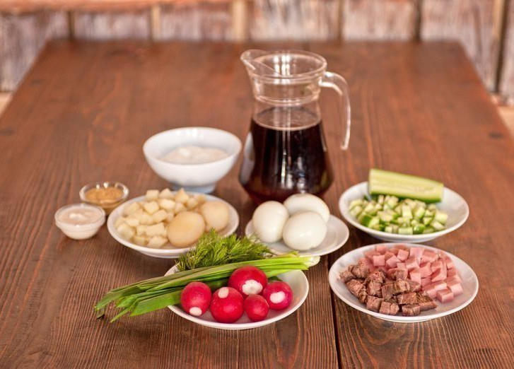Начнем с ингредиентов. Мы обошлись простым рецептом, где присутствует вареная колбаса и квас из магазина. Итак, для приготовления вкусного холодного супчика вам понадобится: