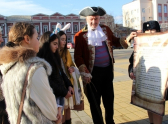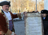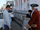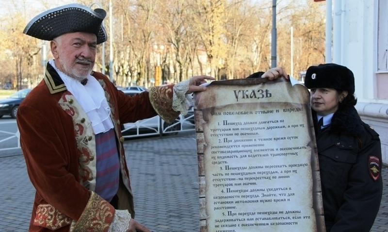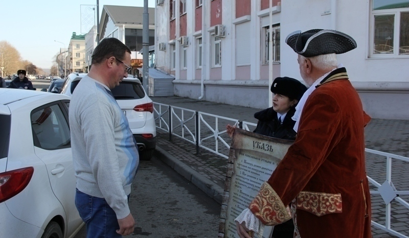 Актер в костюме Петра I вышел на улицы Майкопа с одним из первых в истории России указов настоящего императора, который регламентировал дорожное движение. Правда тогда на проезжих частях ездили всадники и конные экипажи.
