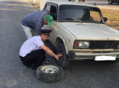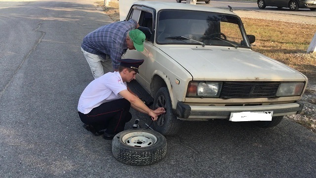 Находясь на дежурстве, дорожные полицейские заметили припаркованный автомобиль на обочине. Хозяин автомобиля объяснил, что по дороге у автомобиля ВАЗ 2105 спустило колесо, но поменять его он не может из-за внезапного плохого самочувствия, вызванного сильной жарой. Сотрудники Госавтоинспекции поменяли колесо и также снабдили водителя минеральной водой.