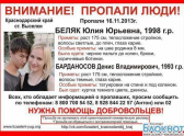 В станице Выселки Краснодарского края разыскивают пропавших Юлию Беляк и Дениса Барданосова. 16 ноября 15-летняя Юлия и 20-летний Денис ушли из дома, а на следующий день на окраине станицы была обнаружена старая иномарка, принадлежащая Барданосову, в которой лежали их мобильные телефоны.