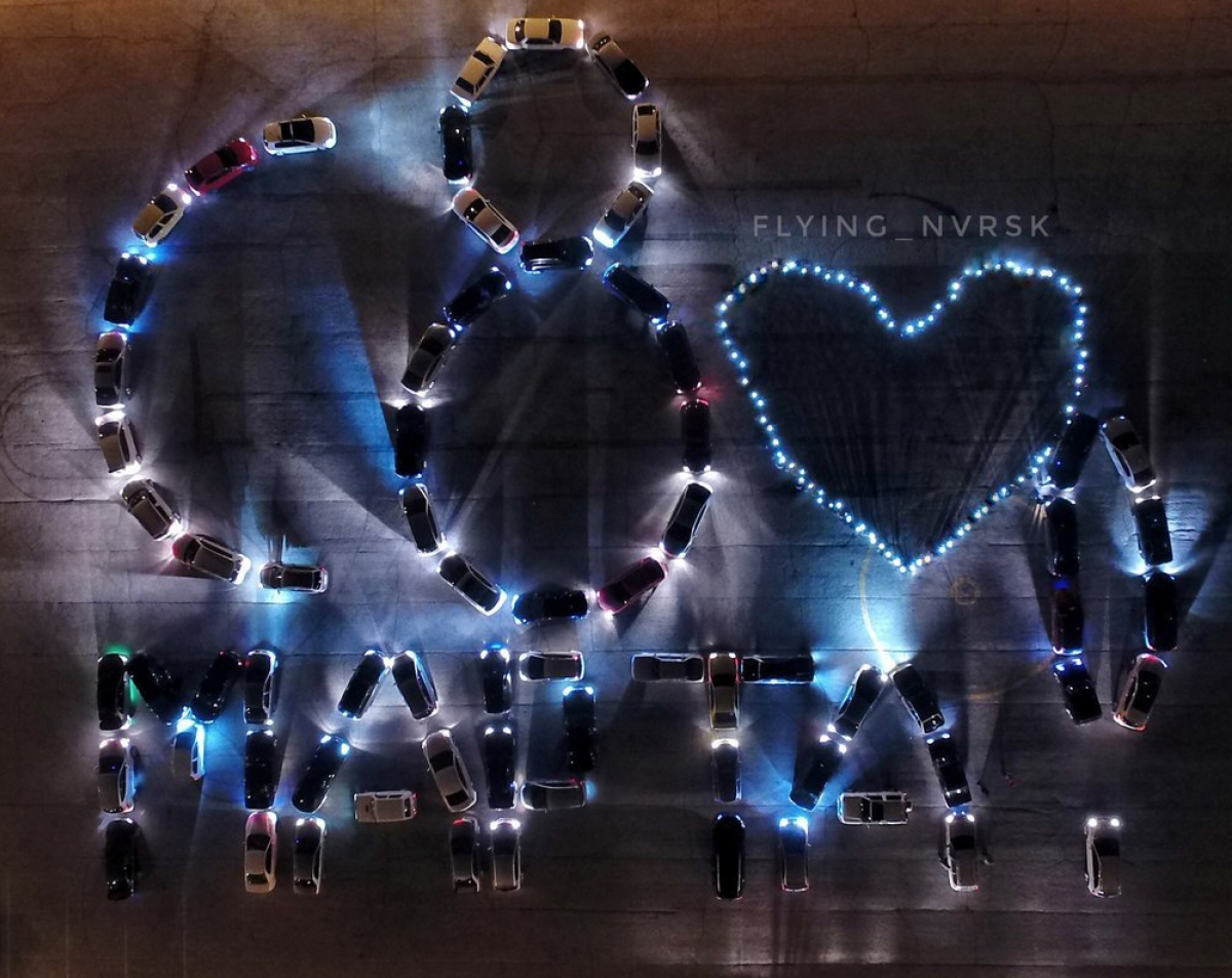 Вечером 8 марта в социальных сетях Новороссийска появился необычный ролик. Мужчины выстроили свои автомобили на площади около ГМУ им. Ф.Ф. Ушакова в виде надписи «С 8 Марта». В машинах водители включили фары и «аварийки», а сами же встали с включенными фонарями и телефонами рядом со своей надписью и изобразили фигуру сердце.