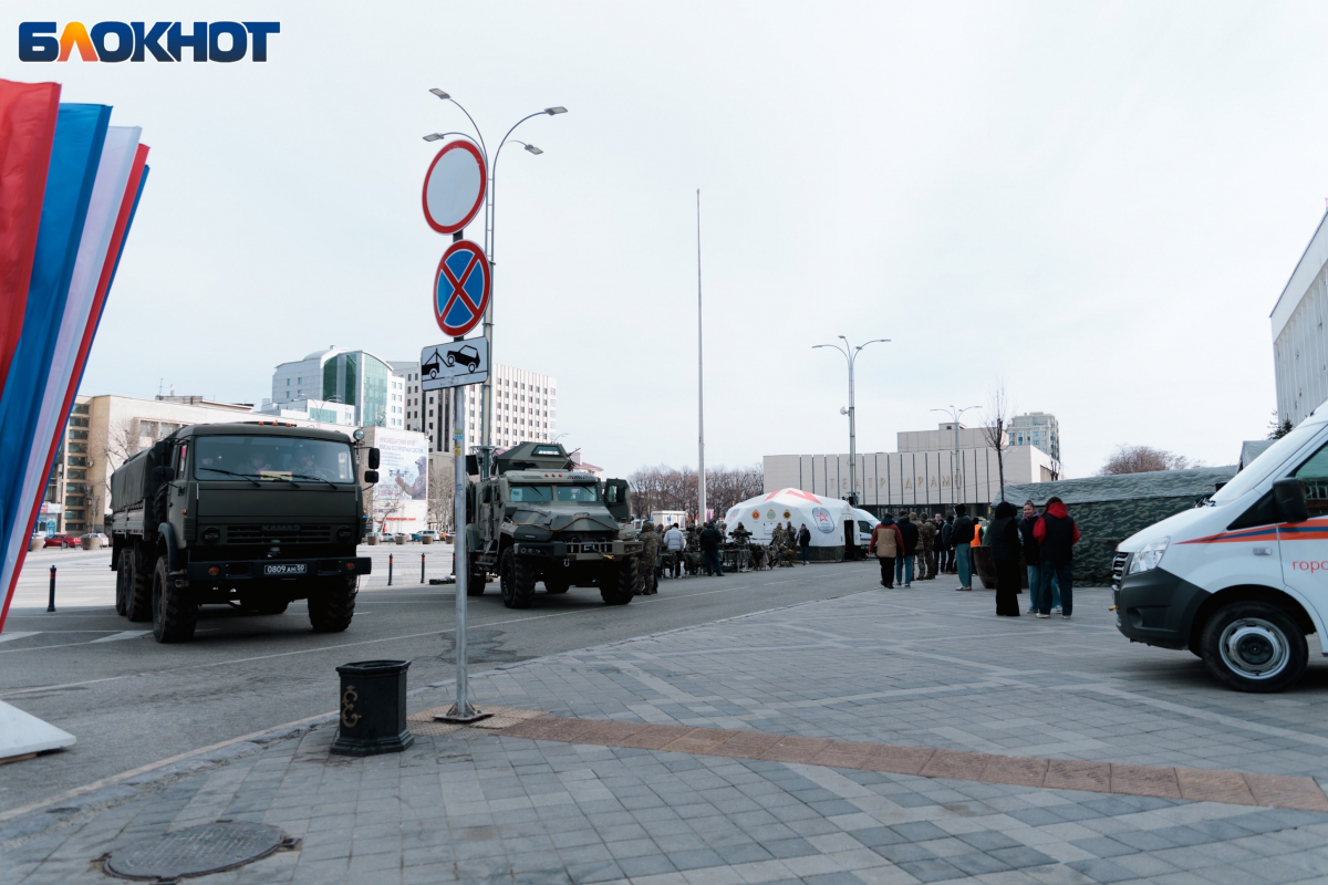 На Главной городской площади краевой столицы в воскресенье начали принимать гуманитарную помощь, которую после Дня защитника Отечества собираются отправить бойцам в зону СВО, а также жителям Херсонской области.