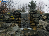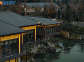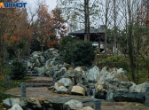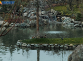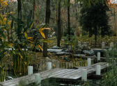 Камни и плитки, аккуратно уложенные по дорожкам, обрамляют различные уголки сада. Вода в прудах, несмотря на зимний период, отражает облачное небо и нежно колышется от лёгкого дуновения ветра. Рядом с водой можно встретить декоративные элементы — сторожевые камни и миниатюрные мостики, которые создают дополнительные акценты в пейзаже.