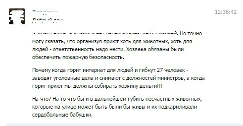 Лидия Таличкина отметила, что сотрудники МЧС опечатали при свидетелях место возгорания и сейчас проводят проверку, после которой станет ясно, что грозит хозяевам приюта за пожар.