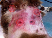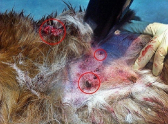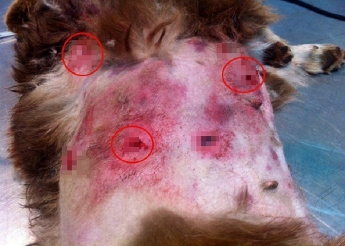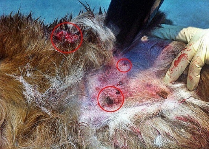 При осмотре Шкоды, так назвали собаку спасители, ветеринары диагностировали большую кровопотерю. Внутренние органы были серьезно повреждены, сломаны ребра, на теле множественные ссадины и гематомы от ранений, разрыв меж-реберных мышц, и воздух поступал в грудную клетку. Злодеи, по всей вероятности, буквально в упор расстреляли питомца.